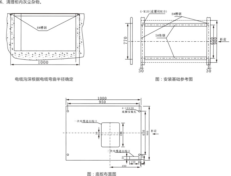 ◎ 將開關(guān)柜按順序放置于基礎(chǔ)上,調(diào)整好安裝的位置,然后用M12螺栓或者用點焊方法進行固定死,柜與柜間與M8螺栓并緊。