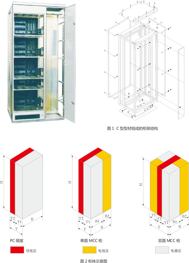 開關(guān)柜柜體基本結(jié)構(gòu)是由C型型材料裝配組成。C型材是以E=25mm為模數(shù)安裝孔的鋼板彎制而成。全部柜架及內(nèi)層隔板都作鍍鋅純化處理。四周門板,側(cè)板則作高壓靜電噴塑。柜體基本結(jié)構(gòu)見圖1所示:柜體基本尺寸如表1表2所示: