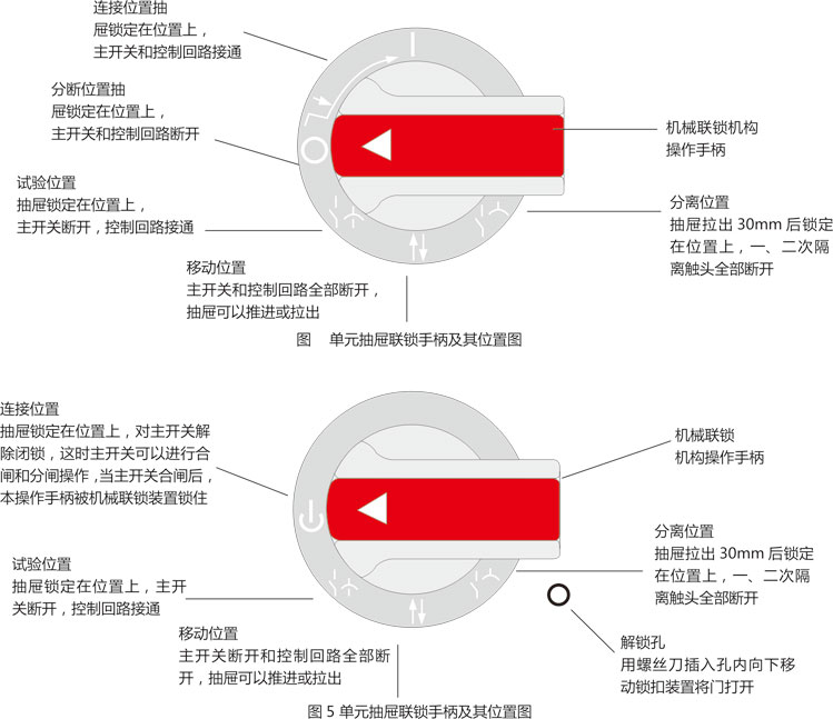 ◎ 抽屜單元有可靠的機(jī)械聯(lián)鎖位置。通過操作手柄控制,具有明顯準(zhǔn)確的合閘、試驗(yàn)、抽出和隔離位置。操作機(jī)構(gòu)功能見圖4、圖5。
