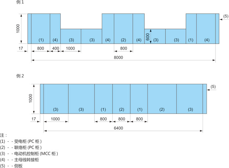 ◎ 當(dāng)PC與MCC二種裝置相鄰排列時(shí),則:1.當(dāng)MCC雙面柜(或600深度的MCC單面柜)與PC柜相鄰排列時(shí),在二柜之間必須加轉(zhuǎn)接柜(其寬度為400mm)如圖6例1所示。2.將單面操作的MCC加深到1000mm時(shí),則可以不加轉(zhuǎn)接柜,如圖6例2所示。
