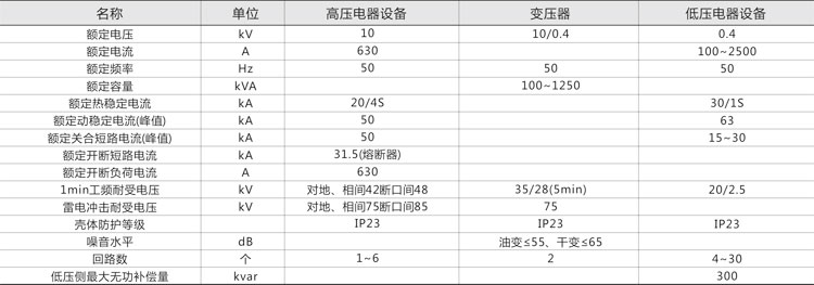 1. 本產(chǎn)品由高壓配電裝置、變壓器及低壓配電裝置聯(lián)接而成,分成三個(gè)功能隔室,即高壓室、變壓器室和低壓室,高、低壓室功能齊全,高壓側(cè)一次供電系統(tǒng),可布置成環(huán)網(wǎng)供電、終端供電、雙電源供電等多種供電方式,還可裝設(shè)高壓計(jì)量元件,滿足高壓計(jì)量的需求。變壓器室可選擇S9、SC以及其他系列低損耗油浸式變壓器或干式變壓器;低壓室根據(jù)用戶(hù)要求可采用面板或柜裝式結(jié)構(gòu)組成用戶(hù)所需供電方案,有動(dòng)力配電、照明配電、無(wú)功功率補(bǔ)償、電能計(jì)量和電量測(cè)量等多種功能,滿足用戶(hù)的不同要求。并方便用戶(hù)的供電管理和提高供電質(zhì)量。