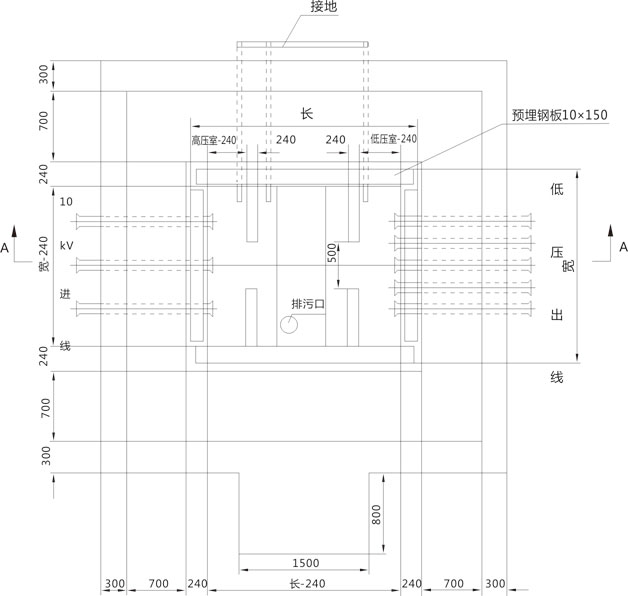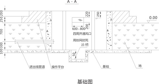2. 基礎(chǔ)設(shè)在地勢(shì)較高處,四周向外排水,采用200#水泥沙漿砌筑,摻3%防水劑,底部向油槽略有傾斜(干變時(shí)取消油槽)