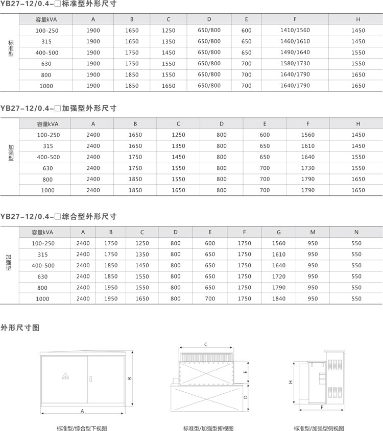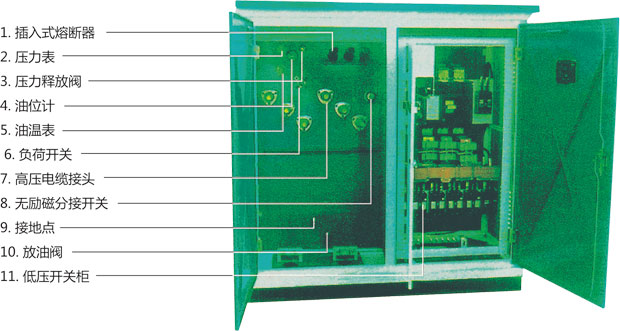 該產(chǎn)品將高壓負(fù)荷開關(guān)、高壓熔斷器置于變壓器油中,具有與變壓器器身共箱或分箱兩種結(jié)構(gòu)形式。油箱采用全密封結(jié)構(gòu),配有油溫表、油位表、壓力表、壓力釋放閥、放油閥等元件以監(jiān)測(cè)變壓器運(yùn)行狀況。該產(chǎn)品分為環(huán)網(wǎng)型、終端型及電源型供電方式。為了使此種產(chǎn)品更適合于我國電網(wǎng)的實(shí)際要求,公司又推了插拔型干式熔斷器,熔絲的熔斷不影響變壓器油的性能。根據(jù)低壓饋出要求的復(fù)雜程度,YBM-12/0.4型產(chǎn)品分為標(biāo)準(zhǔn)型、加強(qiáng)型和綜合型三種外殼形式,使用戶和設(shè)計(jì)單位在選型時(shí),做到更靈活、更經(jīng)濟(jì)。